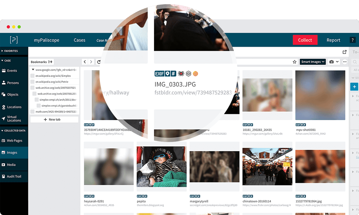 Paliscope Discovry allows investigators to quickly and easily collect open source data for review and analysis, sort and prioritize among the collected data, connect correlating intelligence to find more clues, and create professional reports to share the results with other parties. Discovry also works as a quality assurance system that secures the authenticity of where and when the data was collected.
