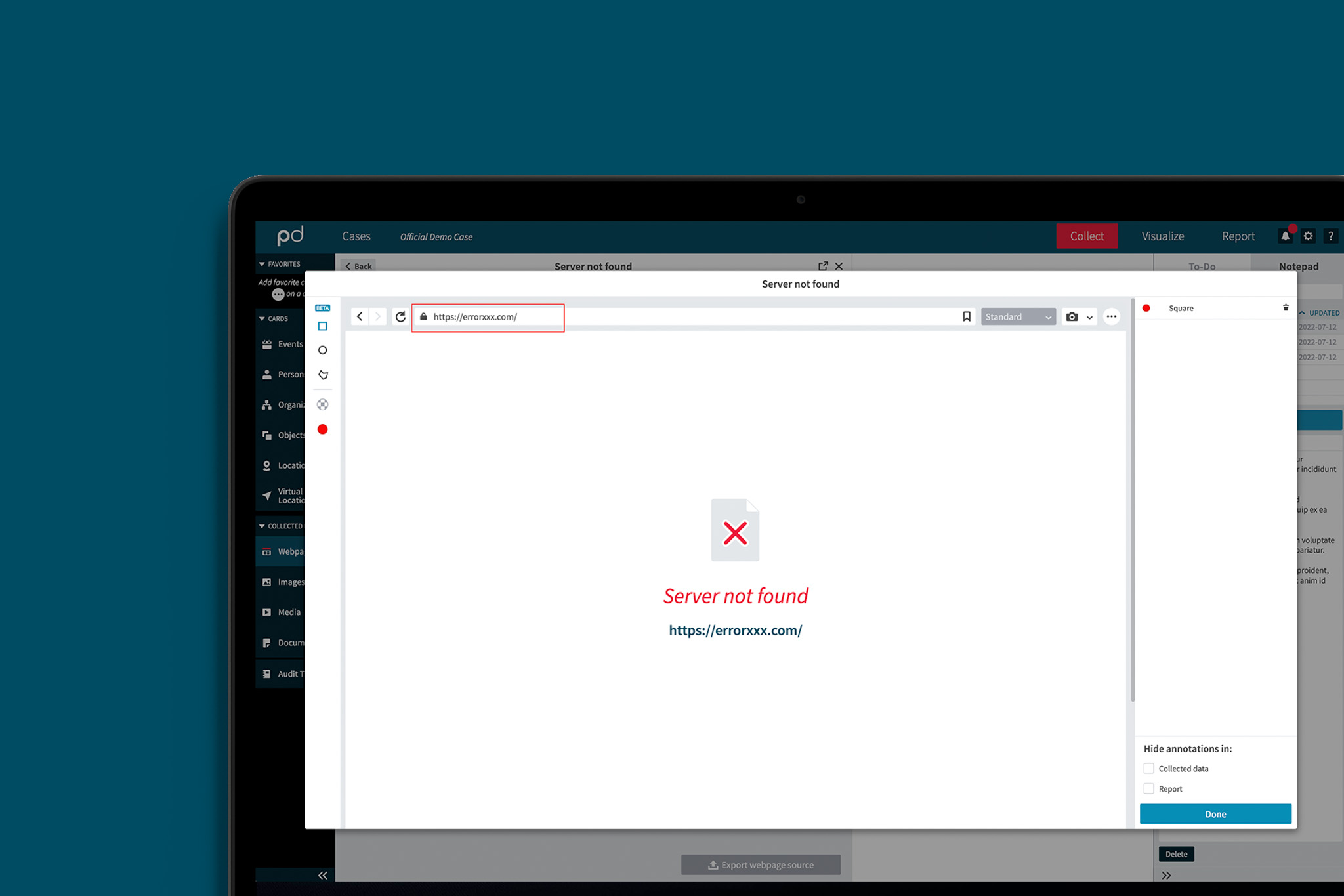 It is now possible to capture error pages with a visible URL field. This is an important feature when you want to document and show a page that has been taken down as part of your investigative work.