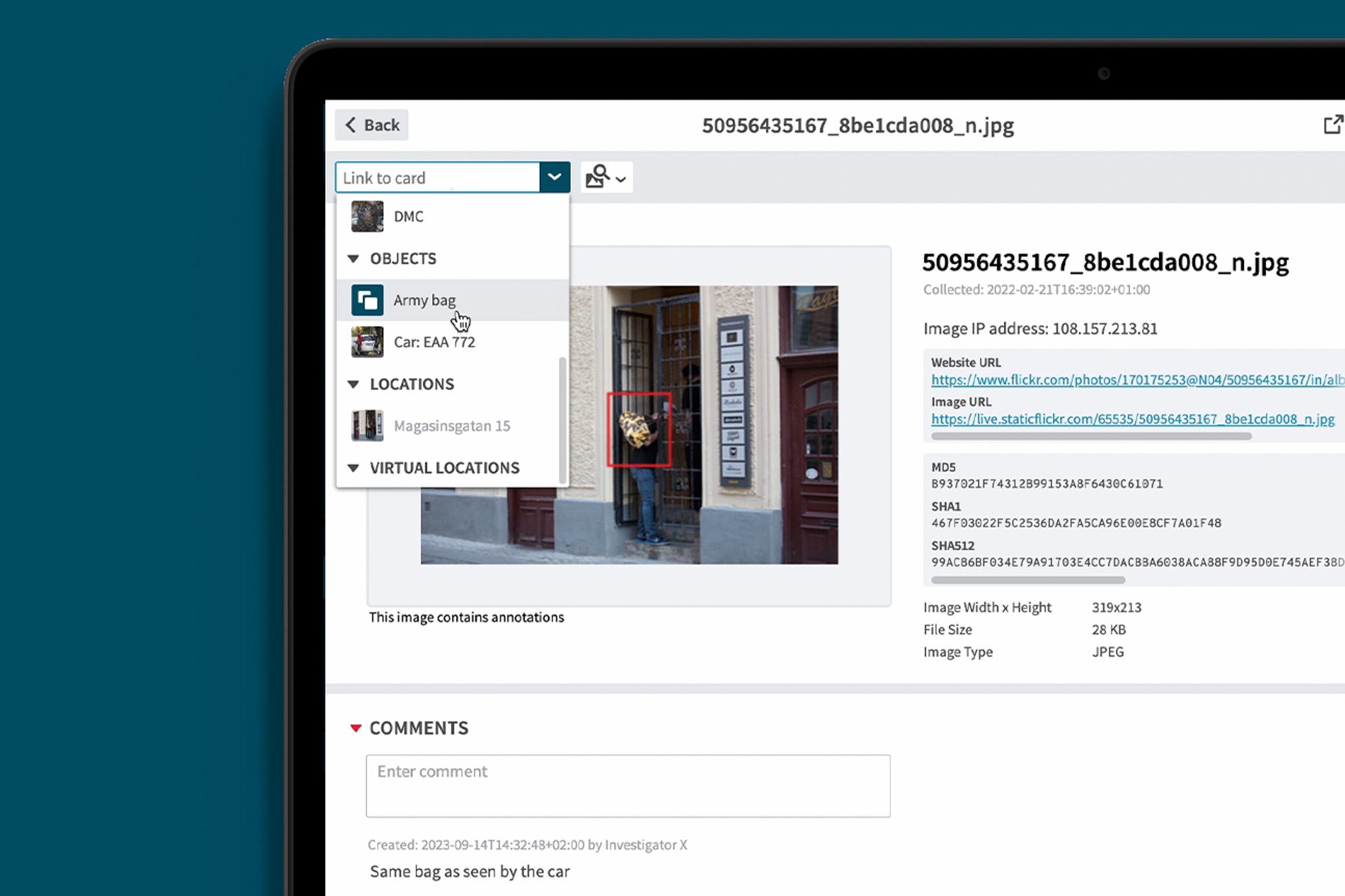 Pinpoint important findings and share with colleagues through Discovry’s new Image Annotations. With this feature you can highlight parts of images and webpage captures to easily communicate elements of interest. Choose between different shapes and colours and use the commentary field to write notes for the final case and/or report.
