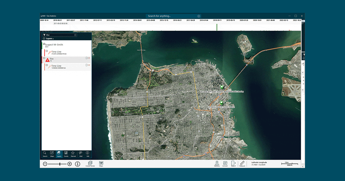 Detect patterns and understand your data better by combining layers of information from your case with layers of external data. A layer can be a person, object, license plate, or anything from your case.