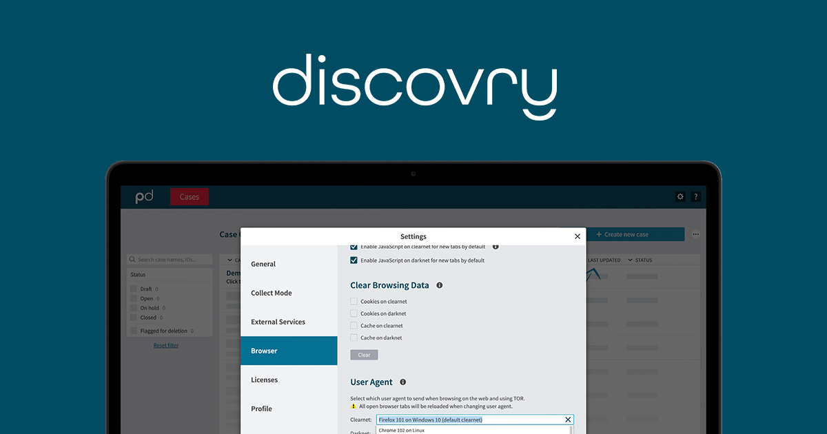Easily select the browser (Safari, Chrome, Firefox, or something completely different) directly in Discovry. If you select Safari, for example, the server will think you are browsing with a Safari browser. You can also choose a different user agent to be used for Darknet browsing.