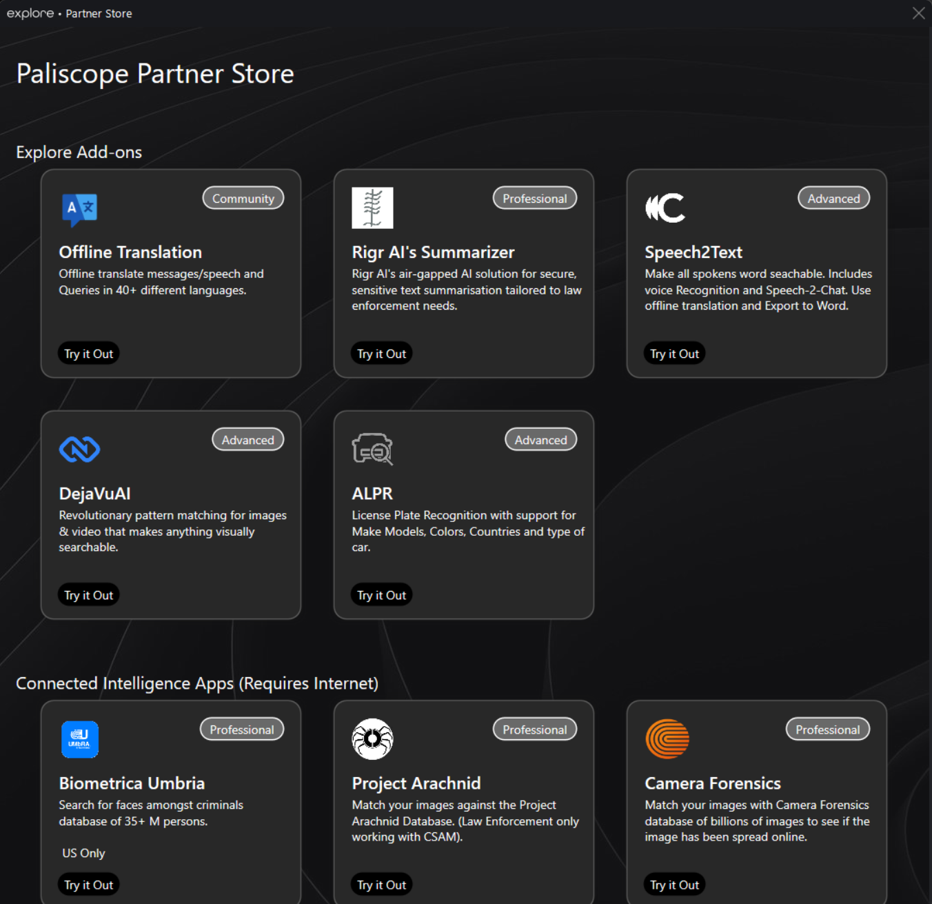 With the release of Paliscope Explore 24.4, investigators now have access to powerful third-party integrations through the brand-new Partner Store. This built-in feature allows you to enhance your investigative toolkit by adding capabilities tailored to your unique needs—all within your existing Explore environment.