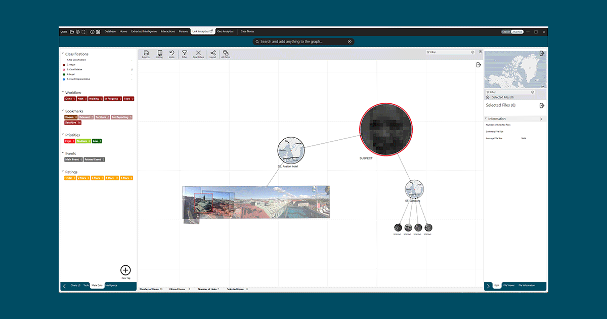 Regardless of whether you work with investigations involving organized crime, IP records, telephone data, trafficking, war crimes, or return of legal processes; the new analytics engine will allow you to extract intelligence from all of your data with a single click.