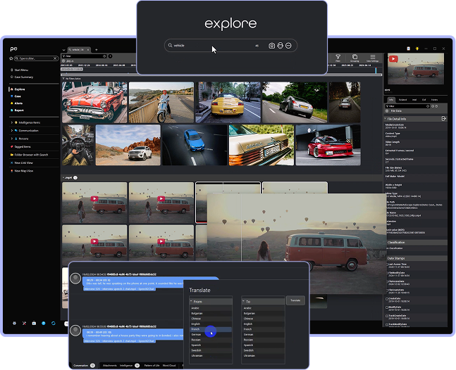 Analyze chat exports , Identify objects, Find persons, Search in media, Overview chat, Explore social media returns, Triage mobile phone exports and more.