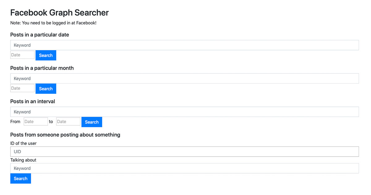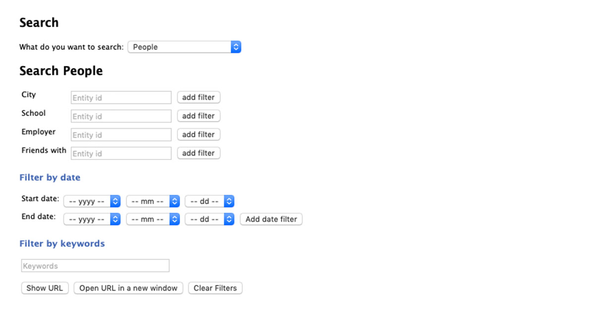 Similar to Sowdust, this is a Firefox extension that lets you perform searches based on the workaround by Social Links. With SearchBook,it is possible to search by groups, visited places, liked photos, etc. You can also combine different search formats to be even more specific. However, right now the tool may only be used for educational purposes. For more information about SearchBook, we recommend you read this great article by Jake Creps.